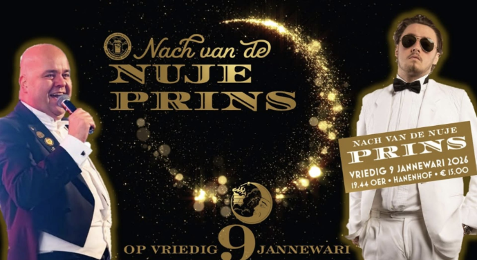 Op vriedig 9 jannewari viere veer de Nach van de Nuje Prins, mit de oetroping van de 79ste Sjtadsprins van de Waereldsjtad. De aovend begint eerder dan geer gewend zeet, al om 19:44. Dit zodat veer al vreug oppe aovend de nuje prins aan uch kenne presenteere en veer same mit de kersverse hoagheid, ein sjoan feëske kenne viere. Onger angere John Tana, Vaerdig en Ivo van der Bijl zulle zörge veur ein sfeervolle aovend. Ivo van der Bijl, nump zelfs de presentasie veur zien raekening. Nao aafloup kent nog tot in de vreuge uurkes doorgefeës waere mit DJ Fiasco.